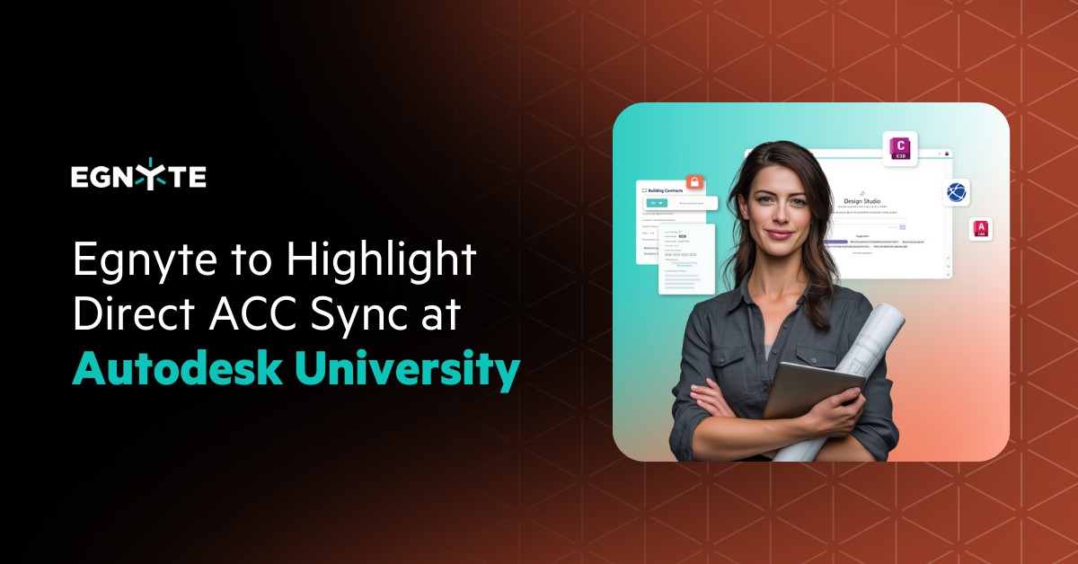 MOUNTAIN VIEW, Calif., September 4, 2025 – Egnyte, a leader in secure content collaboration, intelligence, and governance, will highlight enhancements to its firm-wide data management solutions at this year’s Autodesk University. Egnyte’s ACC Connector is a direct, one-way sync with Autodesk Construction Cloud (ACC) that streamlines workflows across the platforms and extends Egnyte’s governance capabilities to data stored in ACC.