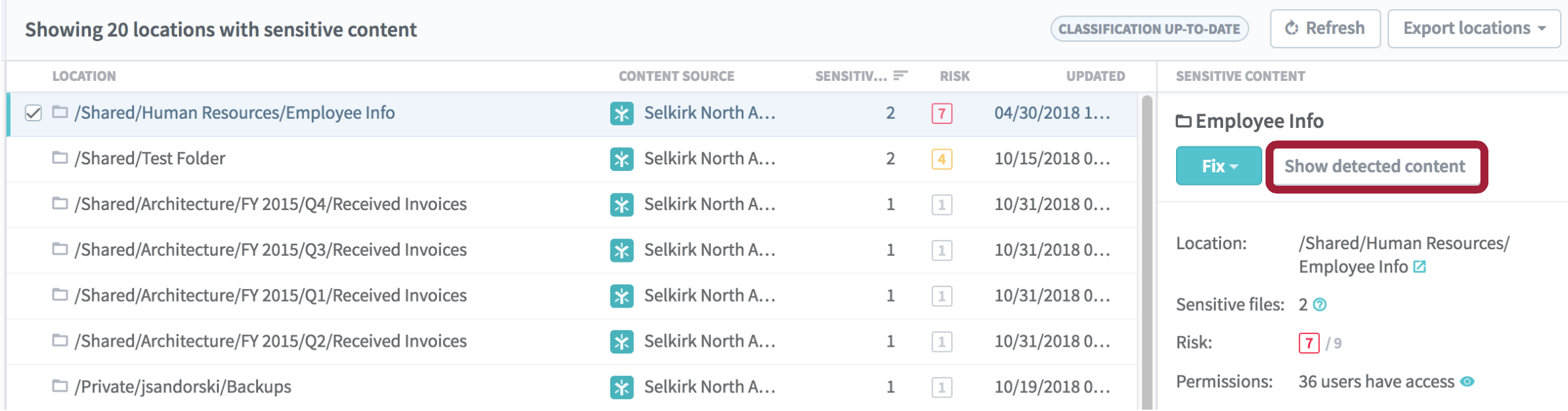 Open the Sensitive Content tab to view the file name, policies matched, and the risk level for each of the files found. Select the folder location and click Show detected content from the details pane.