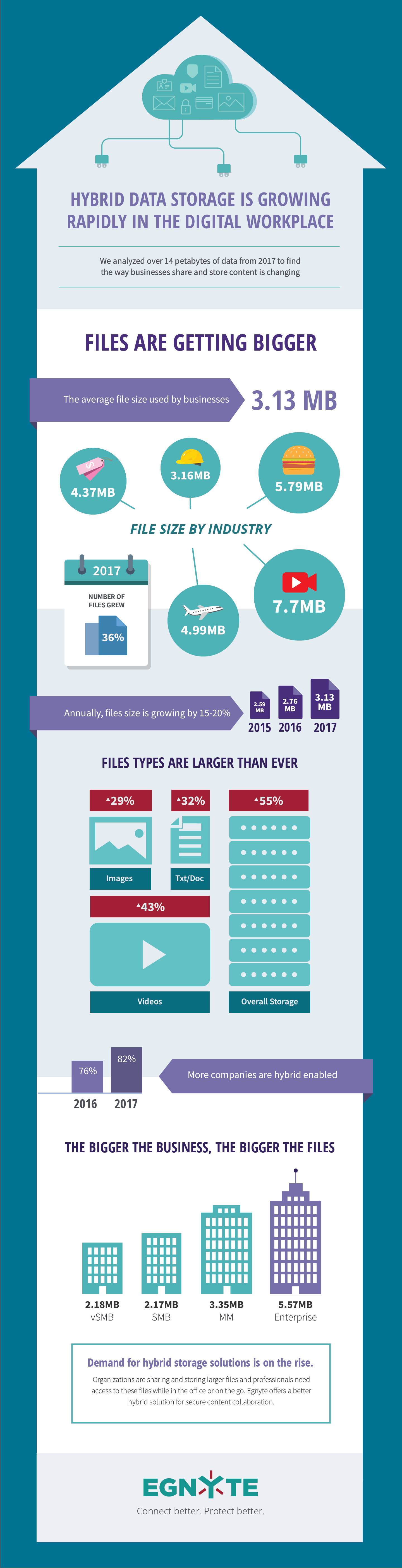 Even with the evolution of cloud storage, hybrid solutions offer performance, cost, and security benefits that are too valuable for businesses to ignore — and we have the data to prove it. Egnyte's team of data scientists analyzed 14 petabytes of data to see why hybrid (a mix of cloud and on-premises infrastructure) has become such a popular deployment model for businesses:
