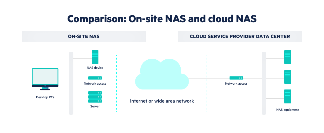 NAS is on-premises or in a data center and connects to a local network. A cloud NAS works similarly to on-premises NAS devices, but is stored in the cloud and supported by third-party providers.