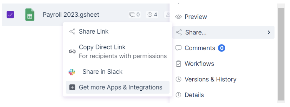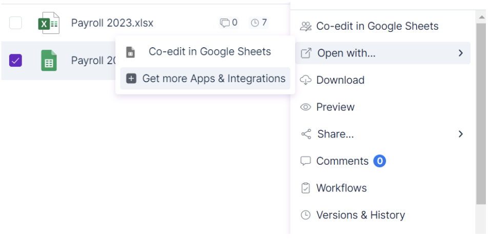 Right-click on the file you want to work on, and the options on the Egnyte App will automatically correspond to the appropriate application. So, if your file is a Google Sheets document, you would select Co-edit in Google Sheets.