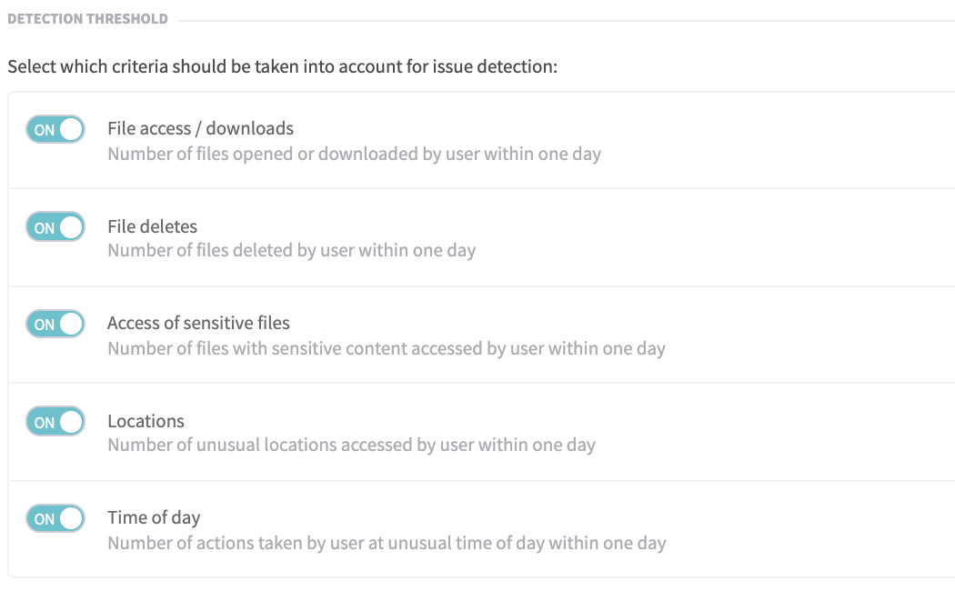 On the Detection Threshold page, you can review the total number of Unusual Access issues that have been detected and set severity levels for issues that affect your environment. You can also establish thresholds that control how far users’ activity needs to deviate from normal usage patterns before an anomaly is detected.