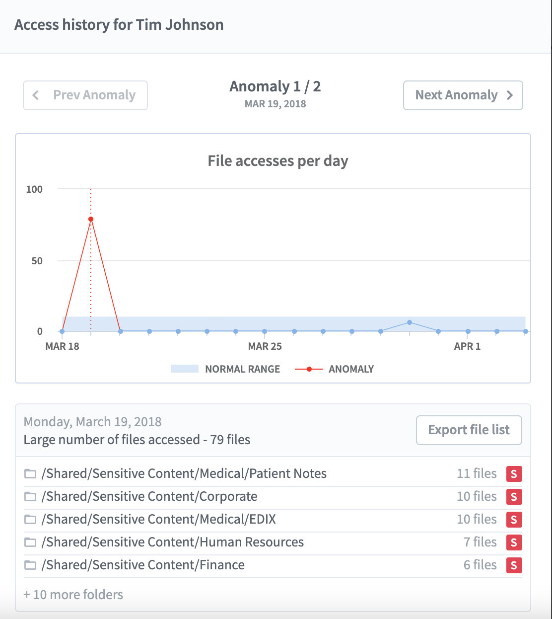 In the classic example above, you can see that user “Tim Johnson” accessed a total of 79 files on a single calendar date, which is substantially higher than the number of files he accessed on other business days. The accompanying recap indicates that Tim accessed a large number of files that contain sensitive information during the time period, including 21 files containing medical data, 10 files containing corporate data, seven files containing human resources data and 6 files containing financial data.