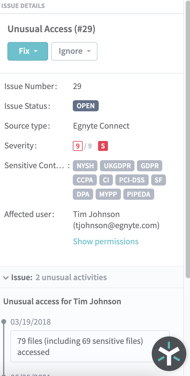In the Issue Detail view, you can see that Tim accessed a vast amount of sensitive data that’s subject to GDPR, UK GDPR, CCPA and PCI-DSS regulations, so that’s one more reason why you should investigate further.