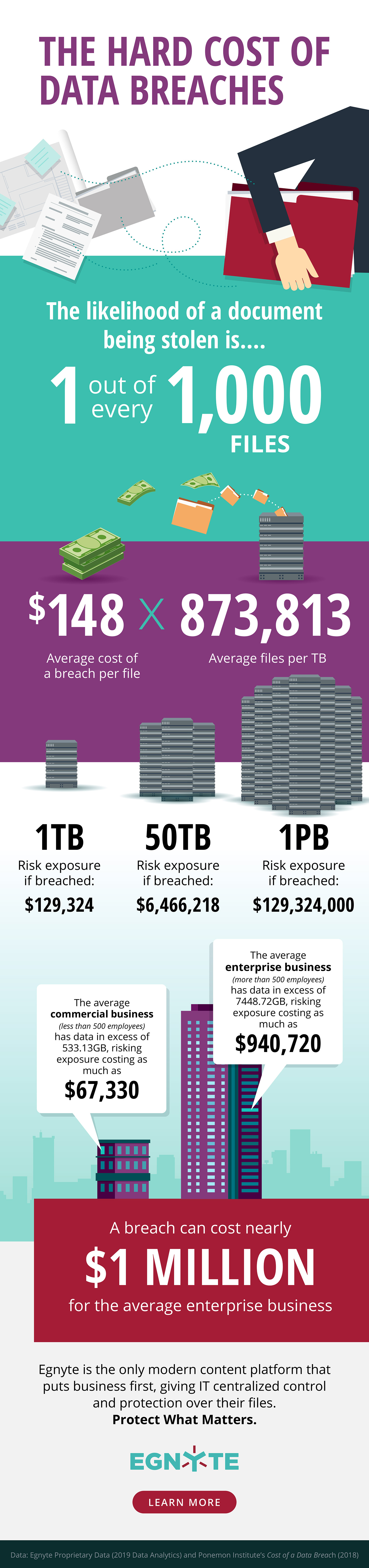 Pair this explosion of data with employee mobility, as today’s teams collaborate across the globe via thousands of applications and devices, and you have what we like to call the "content complexity challenge." With so many variables for how content is accessed and shared, it’s increasingly difficult for businesses to maintain complete visibility and control, making them much more susceptible to being breached. Whether an internal user unintentionally shares sensitive content or ransomware infiltrates your organization, the hard costs of being breached can be crippling.